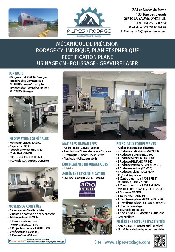 • Aciers, inox, cuivre, bronze, aluminium, titane, inconel, carbone, céramique, cobalt, invar, verre, plastique, polissage saphir.