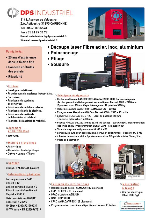 • Centre de découpe LASER FIBRE AMADA ENSIS 9000 Kw avec magasin de chargement et déchargement automatique - Format 4000 x 2000mm. Épaisseur maxi 25mm. Capacité magasin : 12 palettes 3300kg