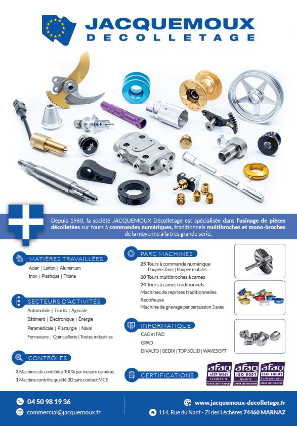 Nous travaillons tous les types de métaux : acier, inox, alliages cuivreux, aluminium, titane, plastique, en barre de diamètre 3 à 65 mm et en lopin, jusqu’à 150 mm sur les tours CN.